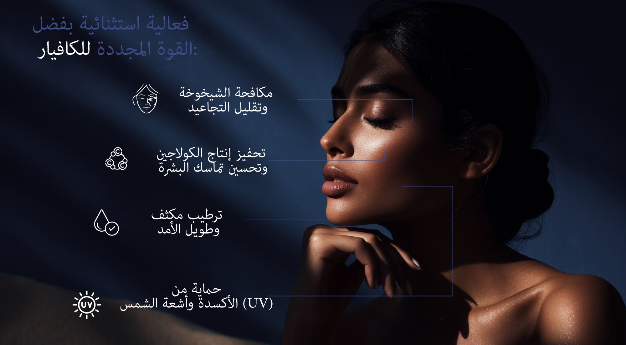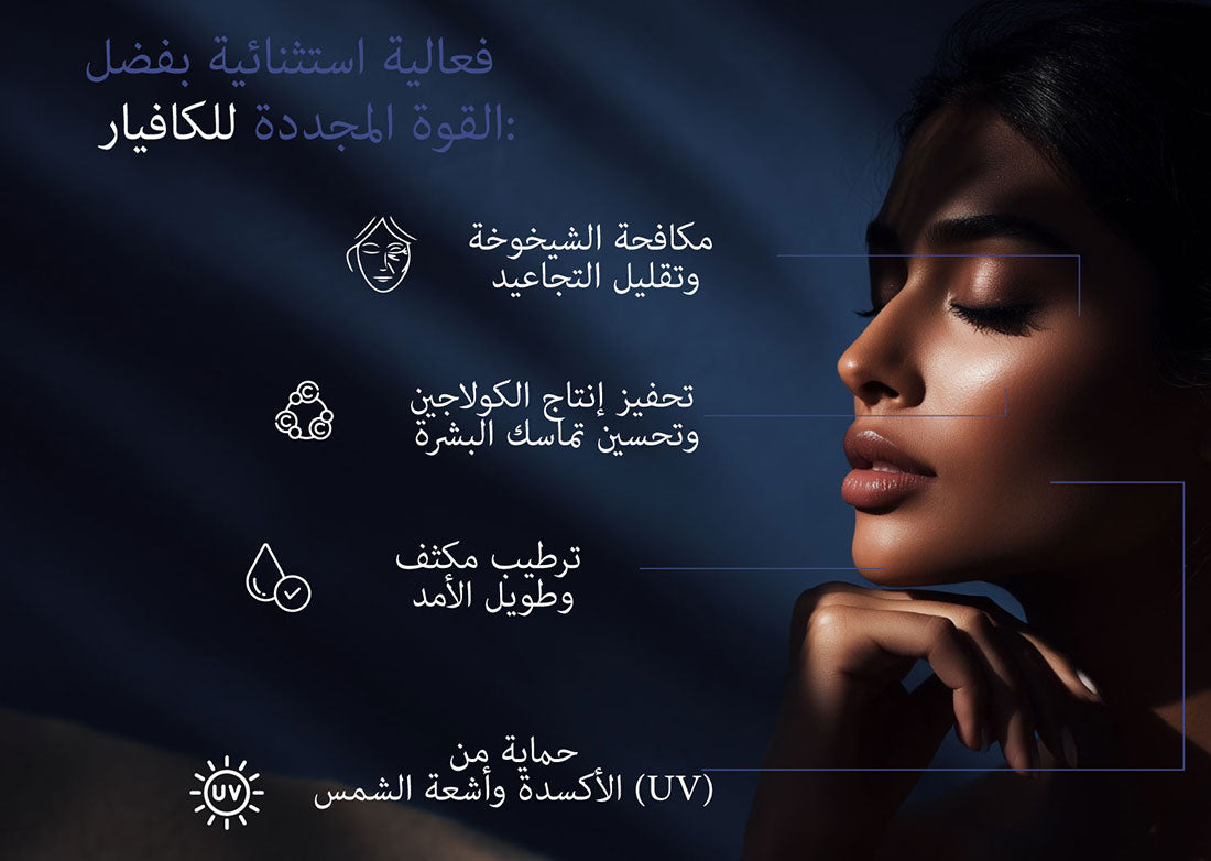 بفضل غناها بالكافيار الأسود المليء بأحماض أوميغا-3 الدهنية والببتيدات، تعمل على تجديد البشرة، تنعيمها ومنحها إشراقة جديدة منذ أول استخدام.