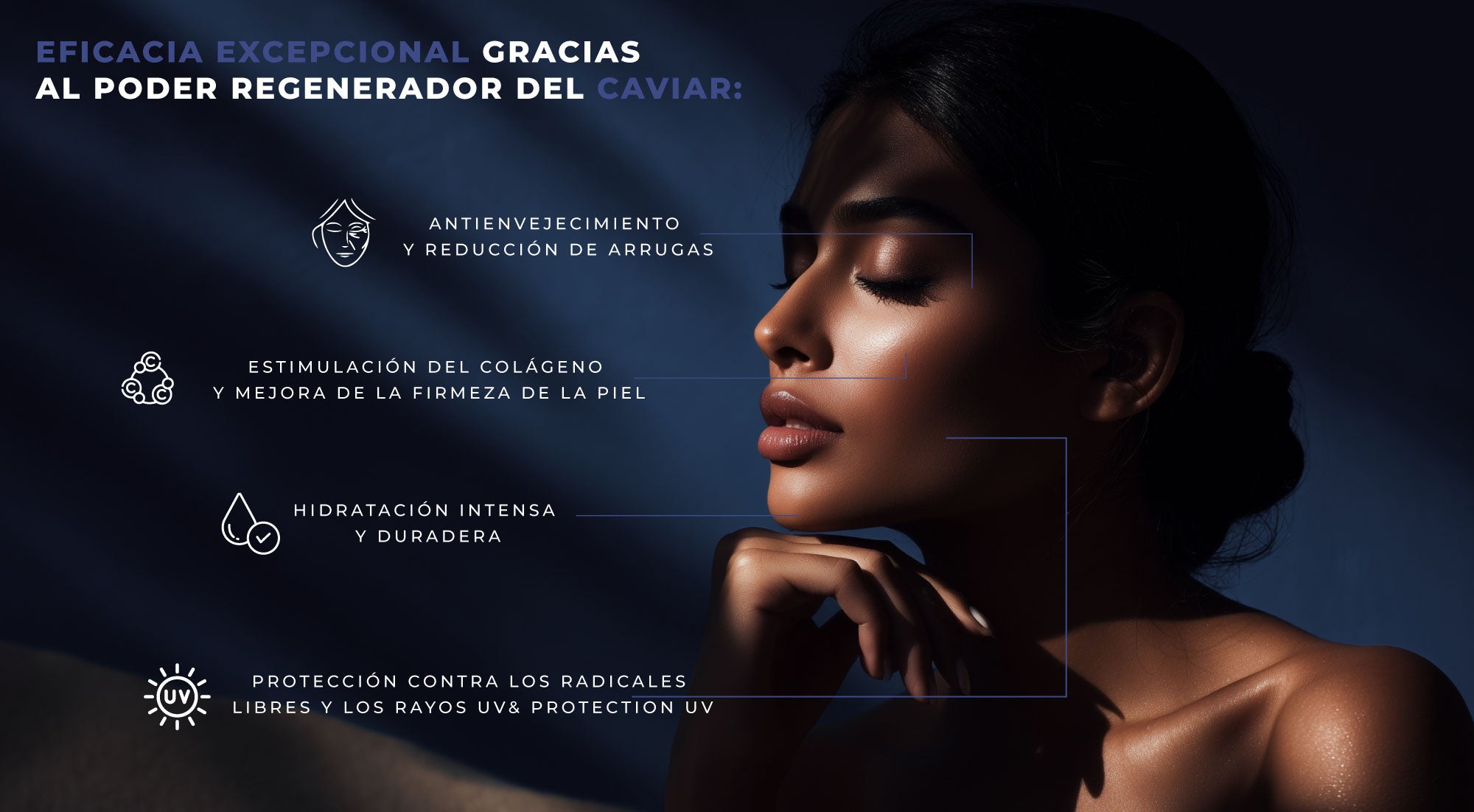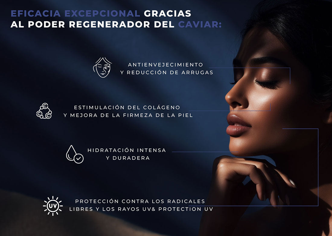 Enriquecida con caviar negro, rico en ácidos grasos omega-3 y péptidos, regenera, alisa y aporta luminosidad a la piel desde la primera aplicación.